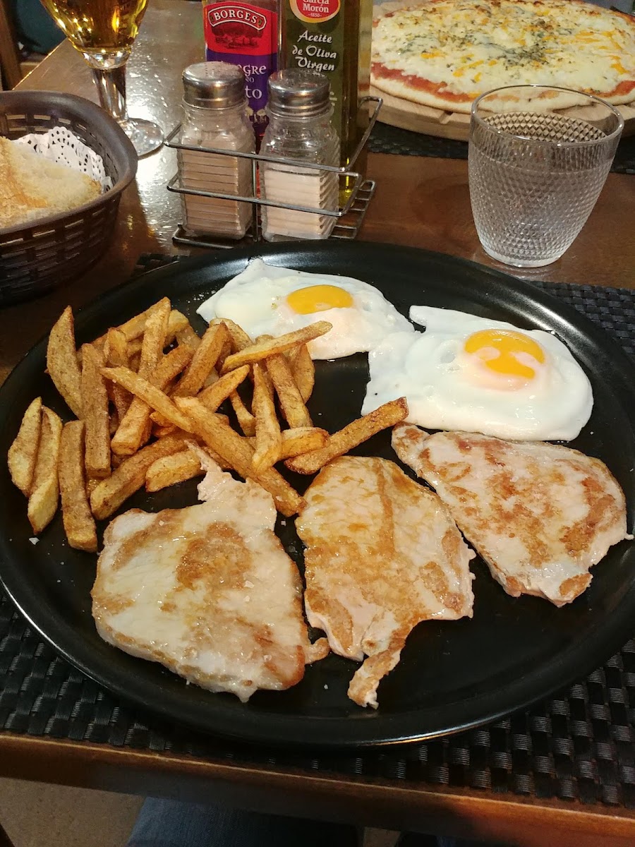 Por ser fin de semana y mediodía solo podíamos pedir el menú, pero hay variedad de platos para poder elegir. Lo curioso es que no ofrezcan ninguna pizza ni hamburguesa. La comida está bien, aunque poca cantidad de algunos platos entre comparación con otros de la zona. La atención ha sido buena, aunque algunos platos entre final casi nos quitan el postre de las manos. Era el cambio de turno a las 15/00 y parece que tenían prisa. Nos parece curioso que se cobre un suplemento de 2,5€ por persona por ser fin de semana, y no lo entiendo. Parece que en esta zona es algo normal, pero si son platos iguales que entre semana, ¿que es lo que cambia para cobrar más por lo mismo?